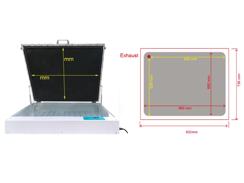 Easy to Use Digital Control Timer Digital display count down timers control lights and vacuum precisely,allows the operator to set vacuum and exposure times,Automatic memory function for working as original seting next time,very easy to operate.
